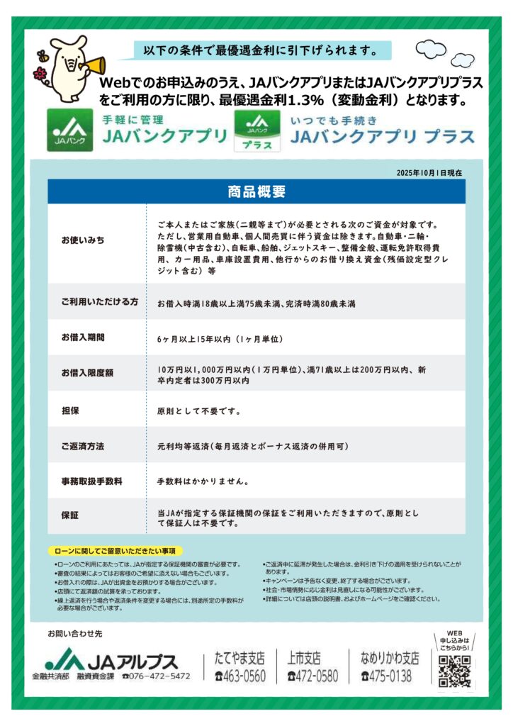 JAアルプスでは、令和7年11月16日(日)と12月21日(日)に各支店(たてやま・上市・なめりかわ)にて、ローン相談会(9時~15時)を開催しております。