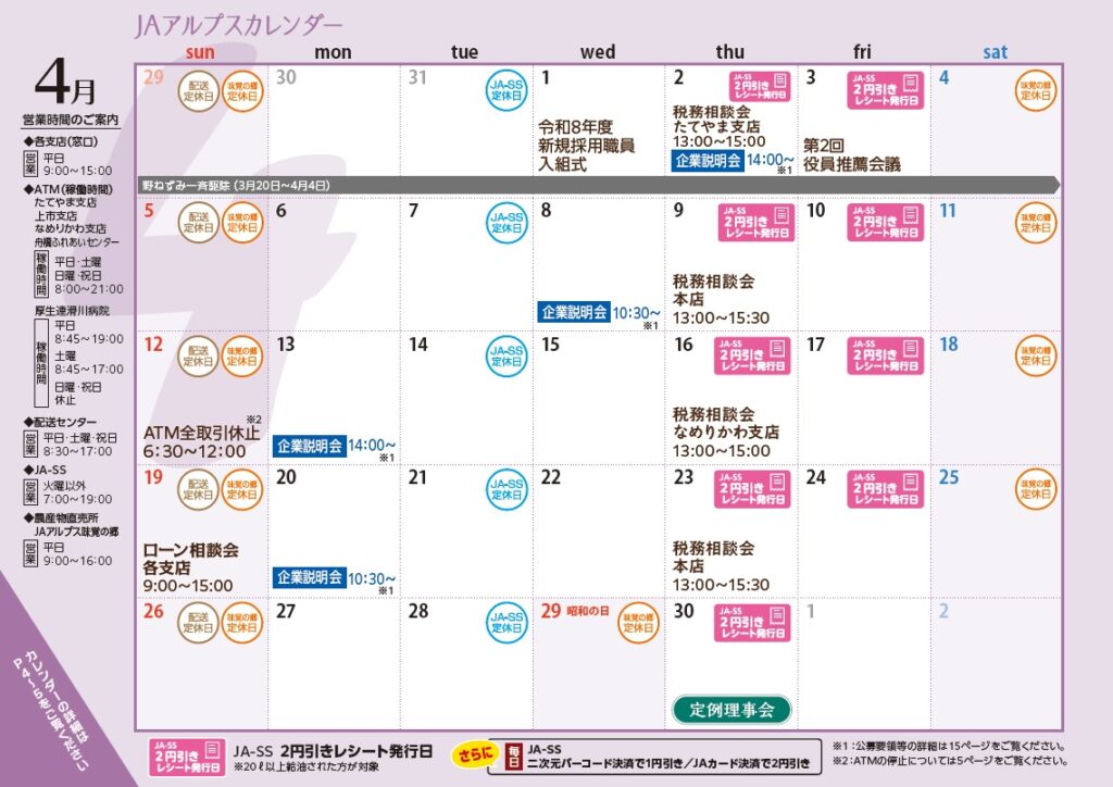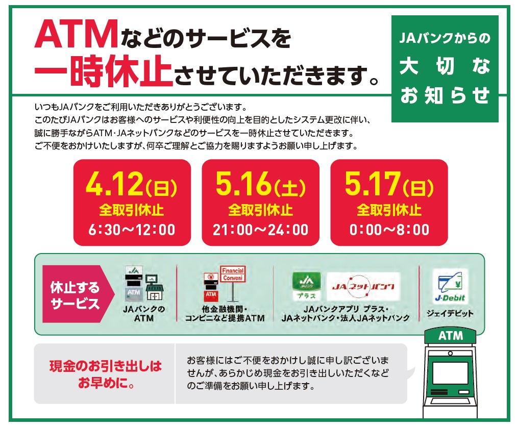 カテゴリを選ぶ JAアルプスからのお知らせ (321) イベント情報 (62) 共済情報 (8) 暮らしの情報 (230) 未分類 (4) 農の情報 (12) 重要なお知らせ (87) 金融情報 (105) 食の情報 (11)
