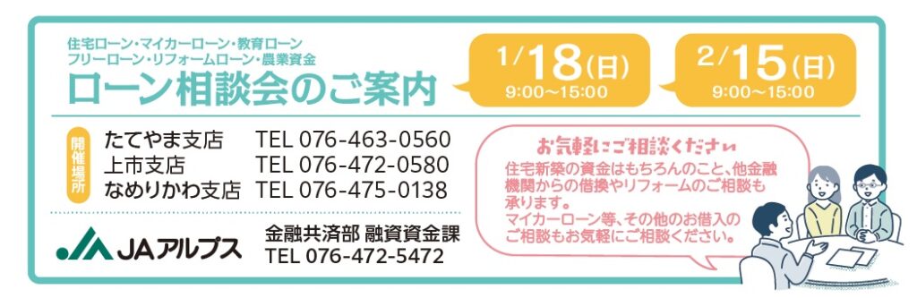 JAアルプスでは、令和8年1月18日(日)と2月15日(日)に各支店(たてやま・上市・なめりかわ)にて、ローン相談会(9時~15時)を開催しております。