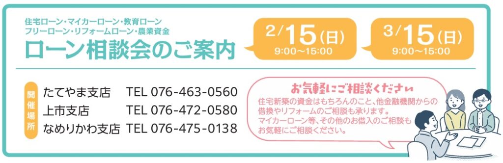 JAアルプスでは、令和8年2月15日(日)と3月15日(日)とに各支店(たてやま・上市・なめりかわ)にて、ローン相談会(9時~15時)を開催しております。