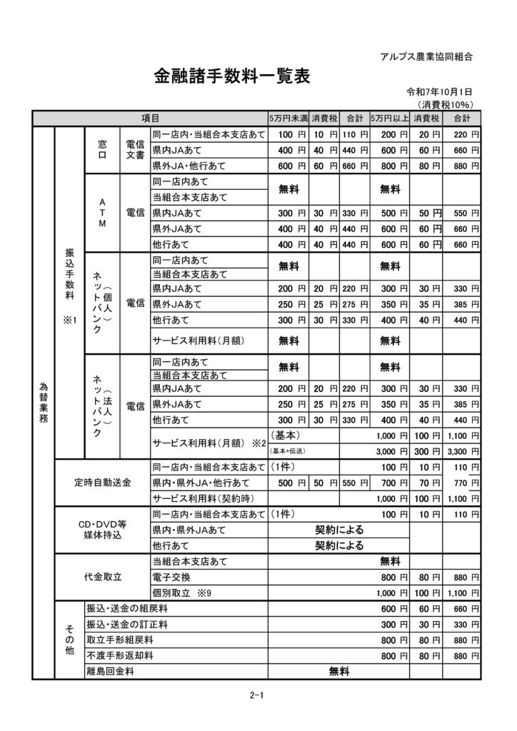 JAアルプスで取り扱っている、貯金・ローンの金利や各種手数料です。